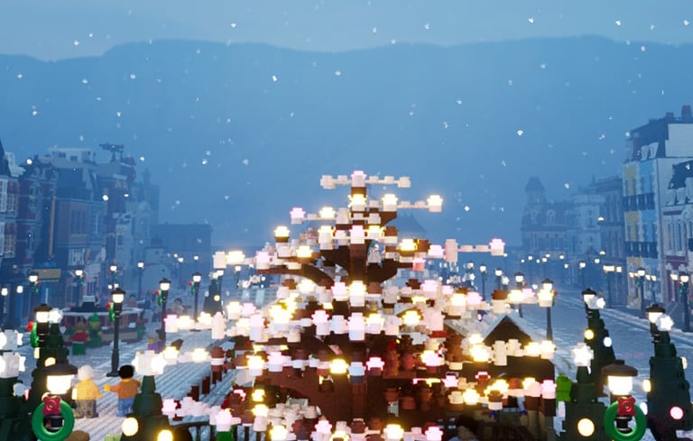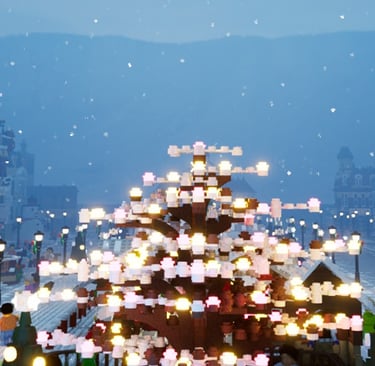 This real-time scene recreates a festive town square alive with light, motion, and atmosphere. I designed modular LEGO assets in Bricklink Studio, refined them in Blender, and assembled the world in Unreal Engine using Lumen lighting and Sequencer animation for cinematic presentation.